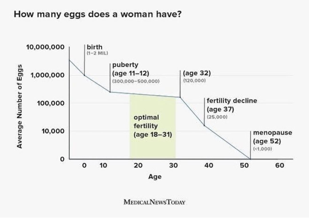 При рождении в организме женщины содержится примерно 1 миллион яйцеклеток. За всю жизнь женщины во время овуляции выделяется лишь 400–500 яйцеклеток. Остальные яйцеклетки со временем естественным образом отмирают, поэтому количество яйцеклеток в яичниках (которое называется овариальным резервом яичников) постепенно уменьшается (см. рисунок 2). Чем меньше яйцеклеток остается у женщины, тем сложнее ей забеременеть. Со временем яйцеклеток остается так мало, что женщина становится бесплодной (утрачивает способность к деторождению).